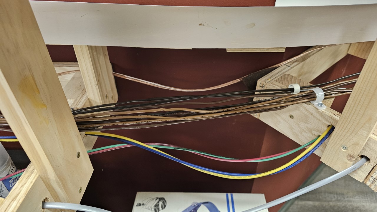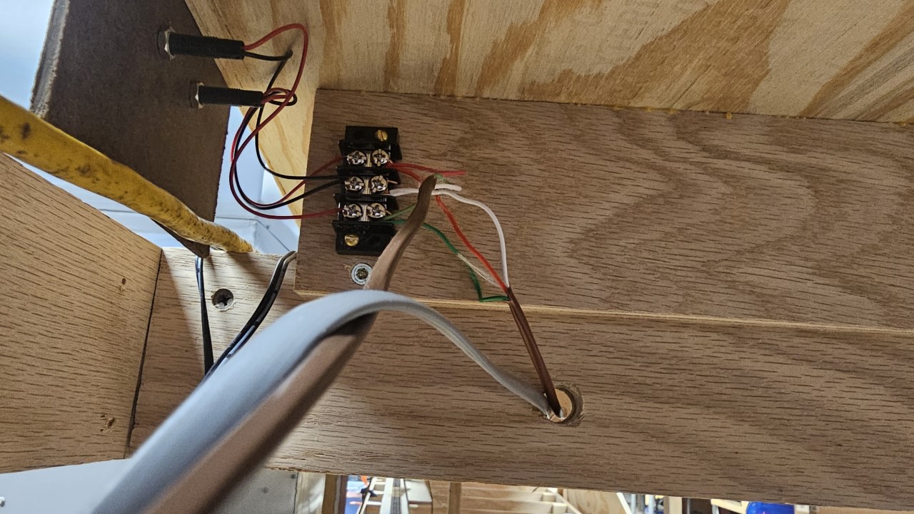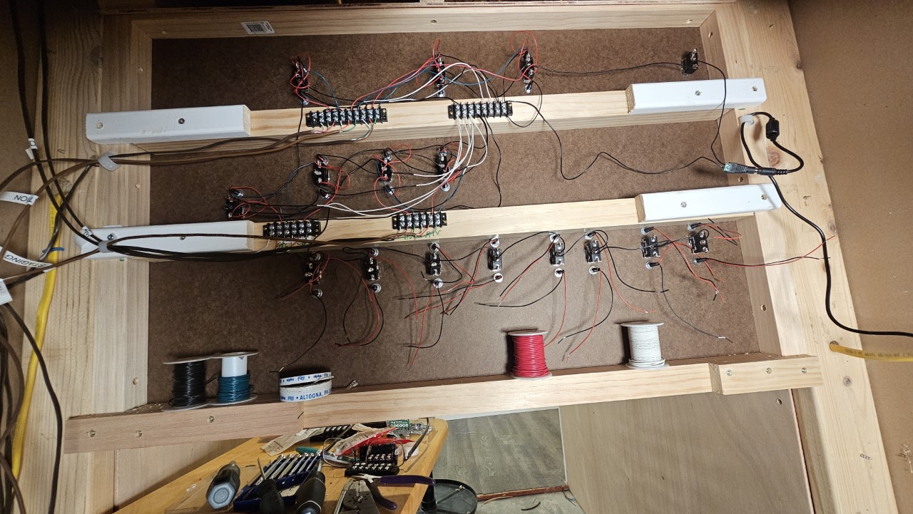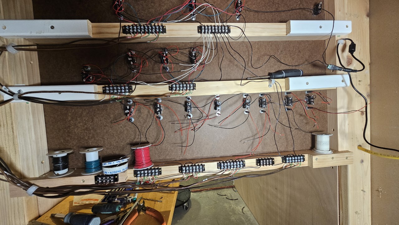 Then it was time to start wiring the panel. I had to crawl into that very confined space behind the panel and sit on a step stool to do the work. I spent a total of probably ten hours back there over about a week. Here the first set of signals is wired in and I'm testing that it actually works before proceeding on with the rest.
