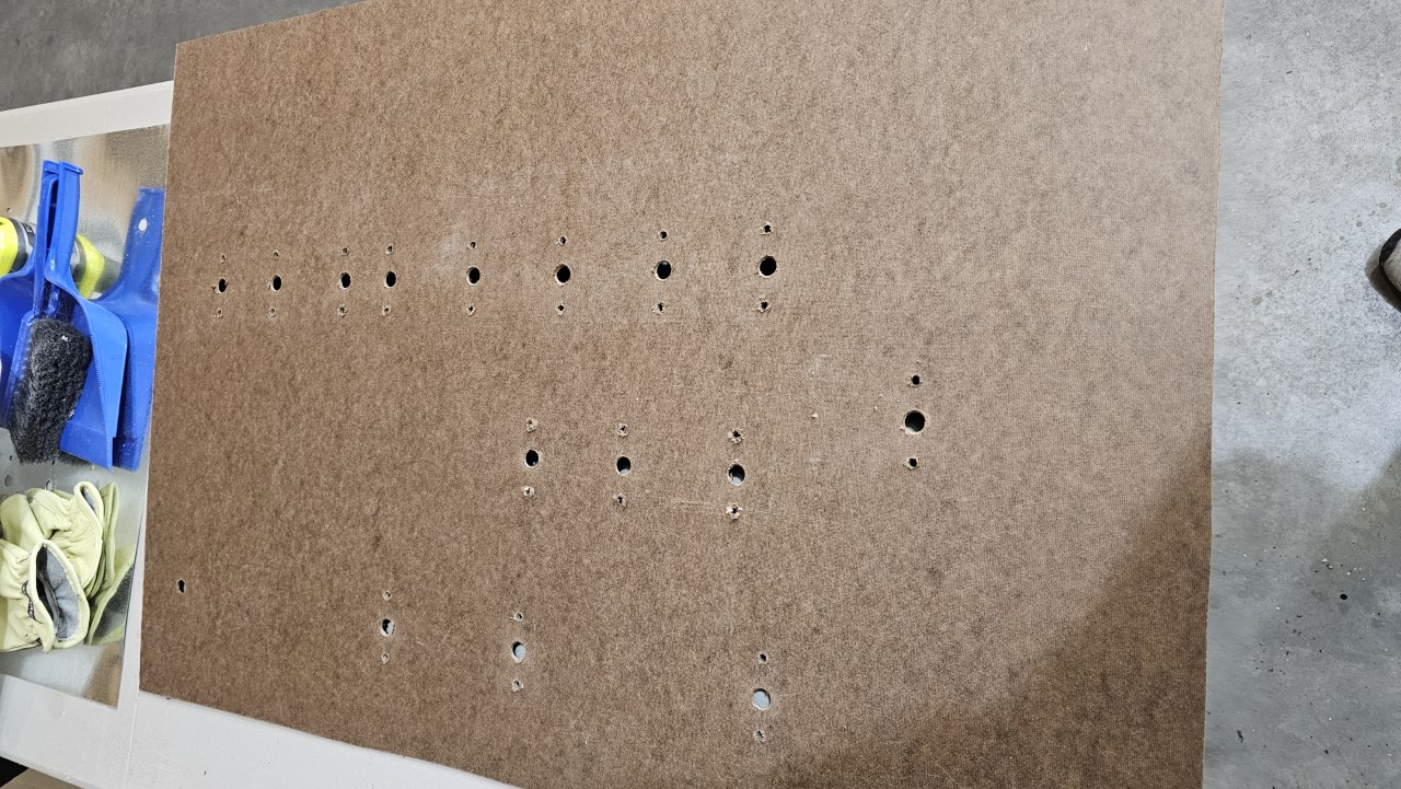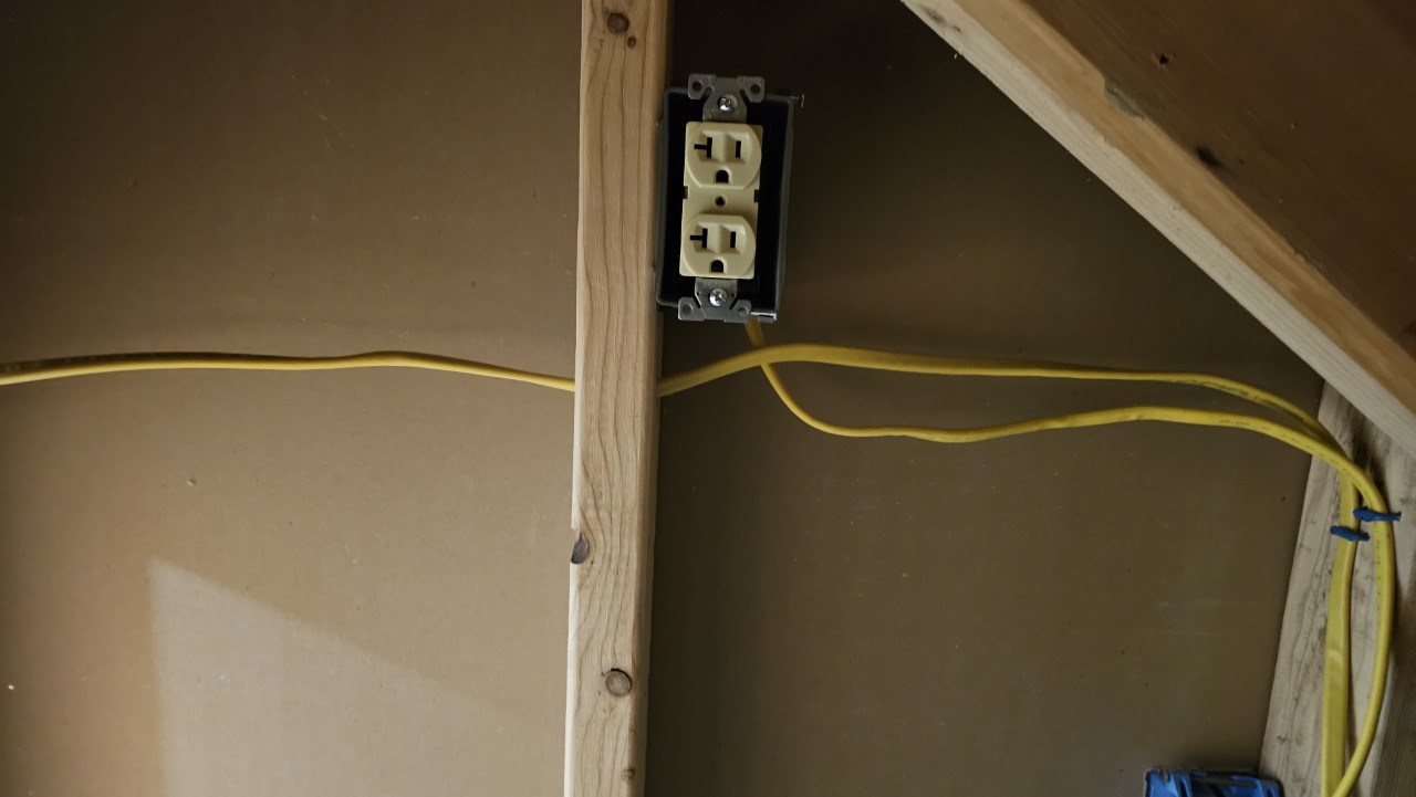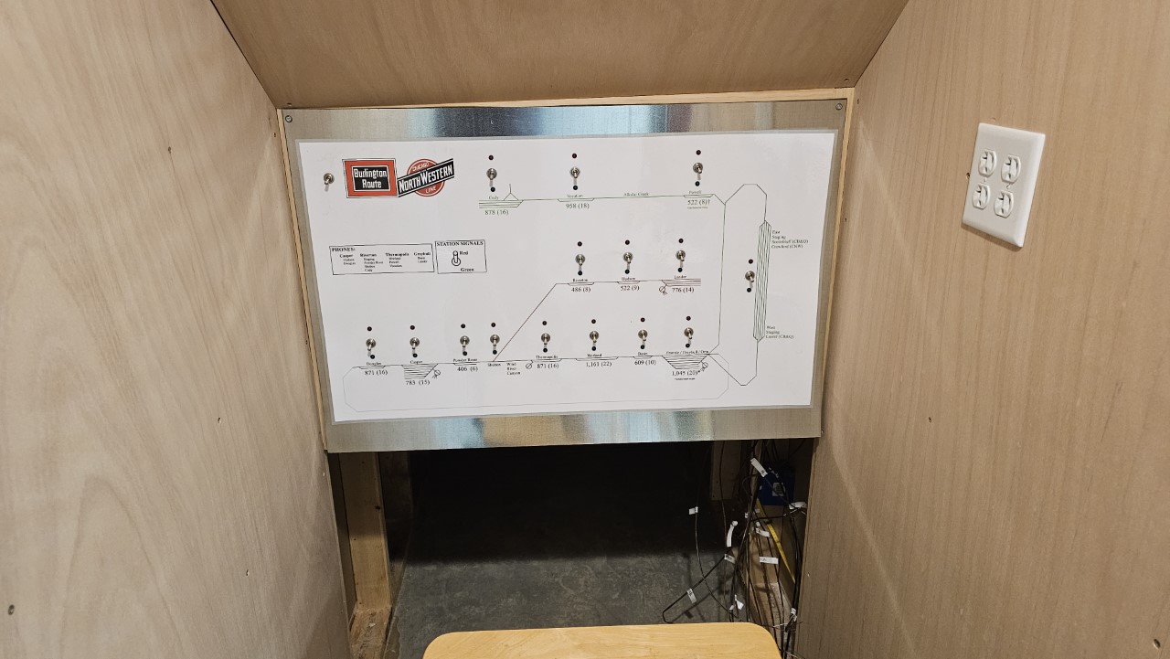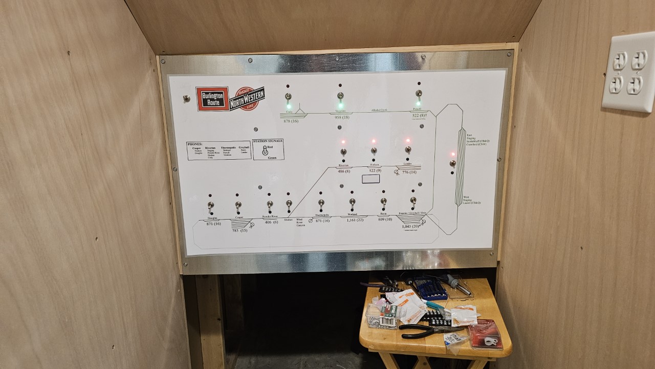 Once all the switches were installed I moved the panel into the dispatcher's office and mounted it with a couple of screws at the top corners. The panel is level; it looks crooked because the two stair walls are not exactly even, meaning the panel is very slightly canted on the vertical axis relative to the stairs.