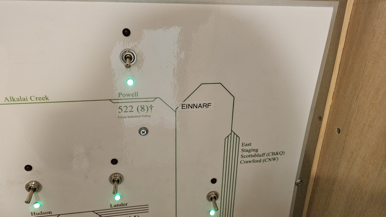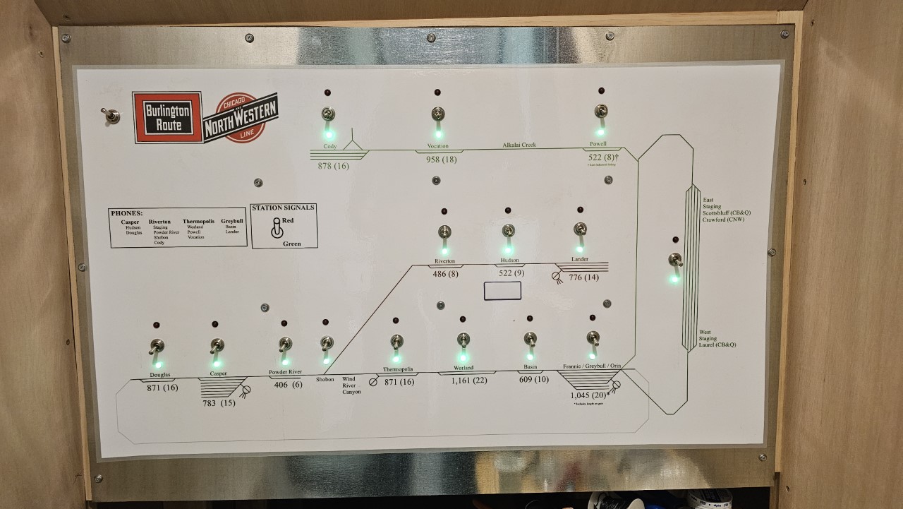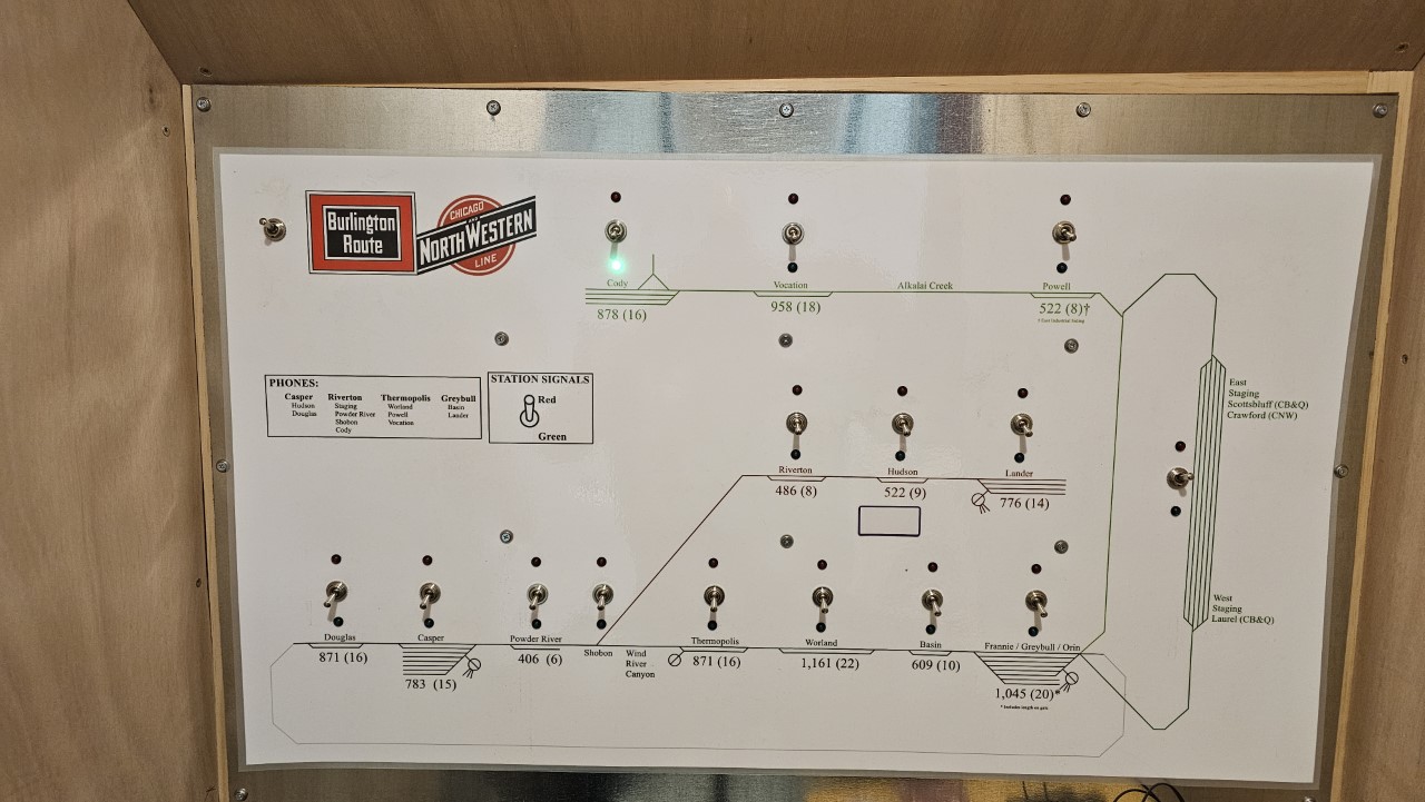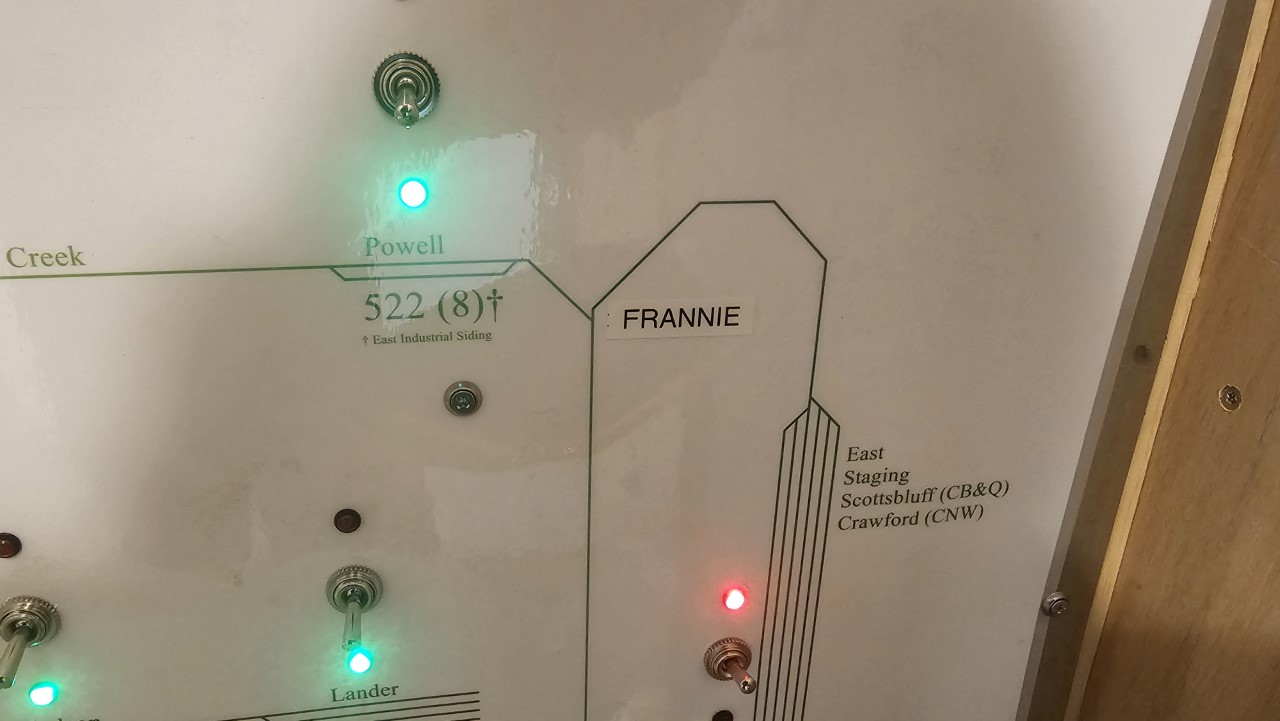 One late addition to the system was designation of the switch taking the Cody branch off the line to East Staging "Frannie." A new set of signals will be installed for that. Calling that turnout Frannie confused the heck out the dispatcher - that junction real life comes off the west end of the Casper division, so on the layout that would lead to West staging.