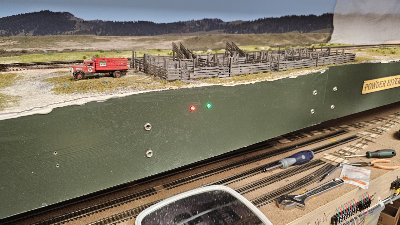 I worked my way around the lower level of the layout from staging, installing the line for Casper, and Douglas, then Greybull. Here's the green signal for Greybull all lit up.