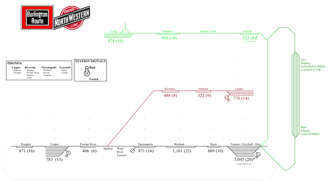 A bit more about the overall system schematic - Each station has a list of all industries underneath it. The large numbers indicate scale feet length of the passing siding (where there is one) or the longest industrial siding. The numbers in parentheses is the maximum length train of 40' cars that can be in the siding and clear of the main. It includes an allowance for a waycar and locomotive.
