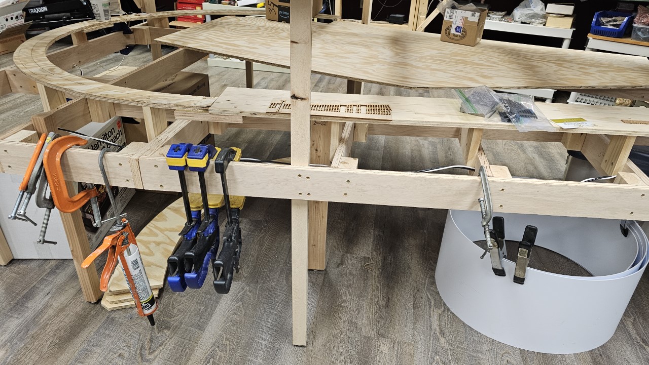 And finally on the 10th of August I also marked and cut another circle of subroadbed for the helix. I'm going to add another entire loop to it to reduce the grade so my steamers can handle longer freights up the stiff grade (currently about 3% when adding in compensation for the curve). I'll reduce distance between the decks by about 3/4 of an inch, which will reduce the total grade by about 0.4%. That will allow one to two car longer trains to make their way uphill.