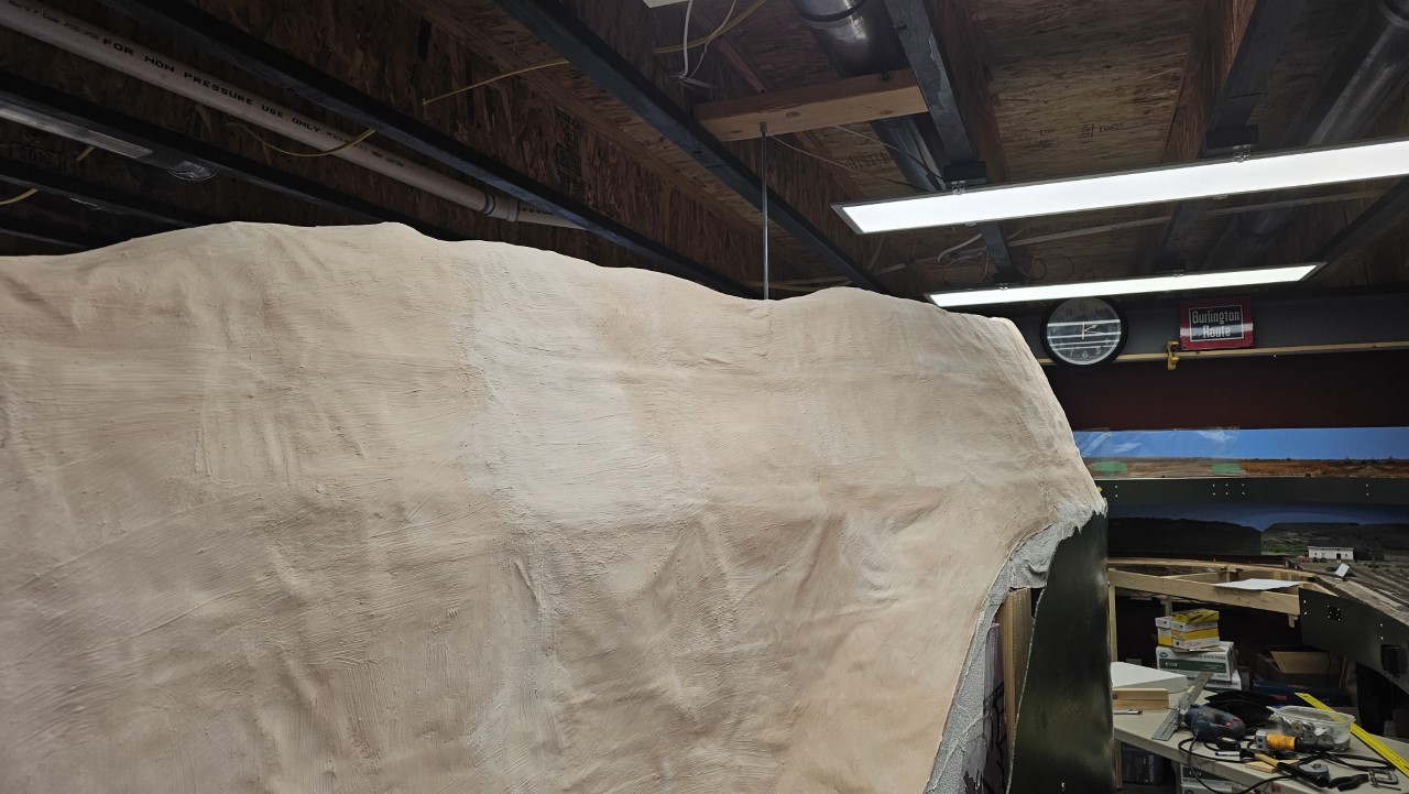 I decided to support the end of the Canyon on the Cody side of the peninsula with a threaded rod from the ceiling above. I added a 2X4 under the upper deck benchwork and a 2X6 hangar to the ceiling joists, then added the threaded rod. In this photo the rod bottom has yet to be trimmed.