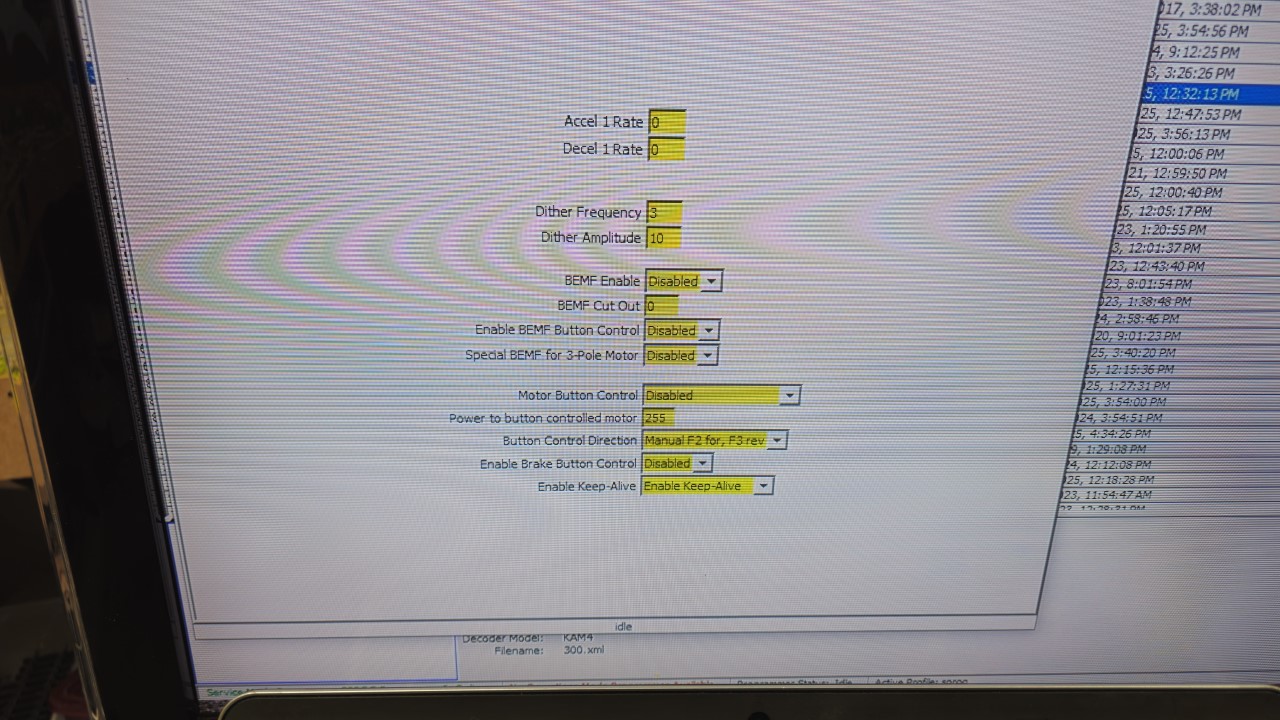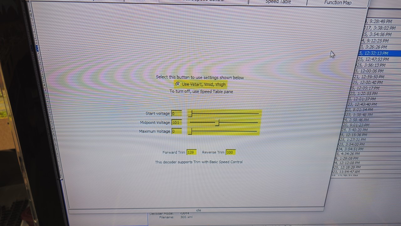It took quite a bit of time to get the Scale Trains and Proto locos properly speed matched. With advice I got on the Model Railroad Hobbyist forum, I set momentum to zero and deactivated Back EMF for all locos. I switched the Proto units from using the speed table to just using Vmin, max and mid. I had to adjust Vmid from the default value to get the midrange speeds to match the Scale Trains units. Here are screenshots of the Proto settings I used: