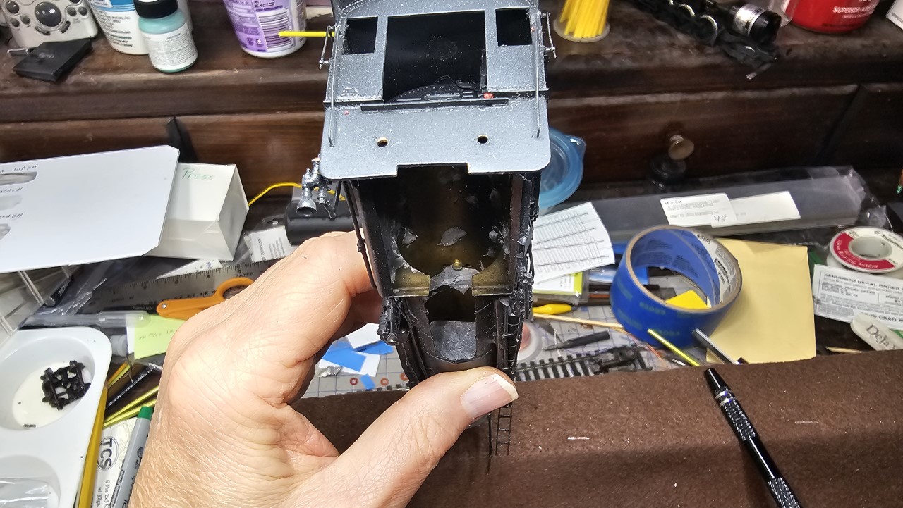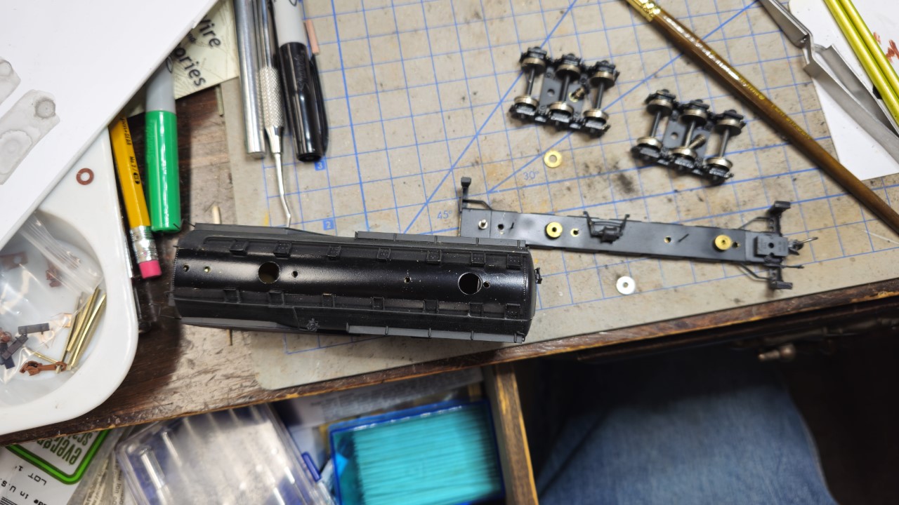 If I was careful I could cut larger openings that the spine of the car would hide once reassembled, but I decided to investigate the possibility of putting the decoder and speaker into the boiler. So I started disassembling the locomotive.