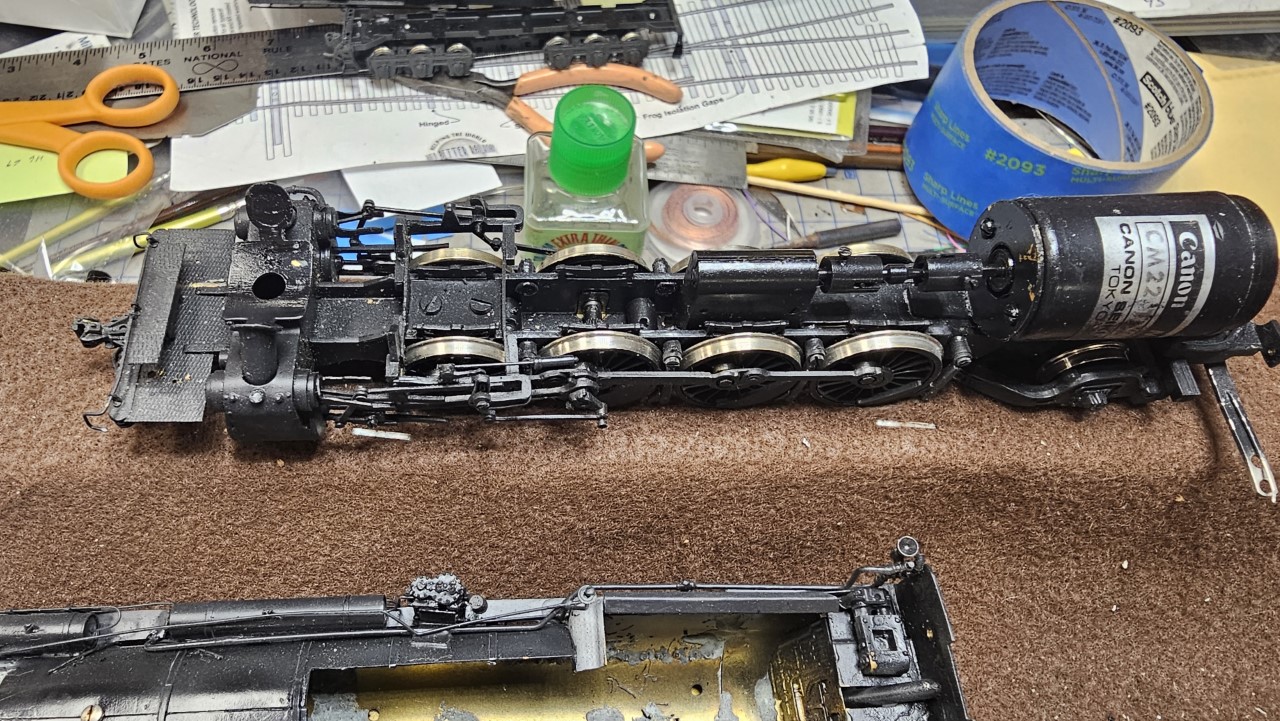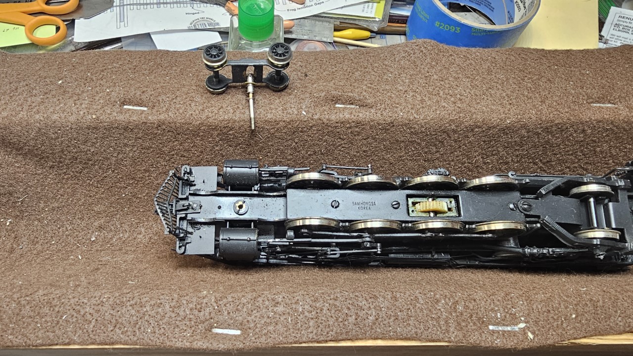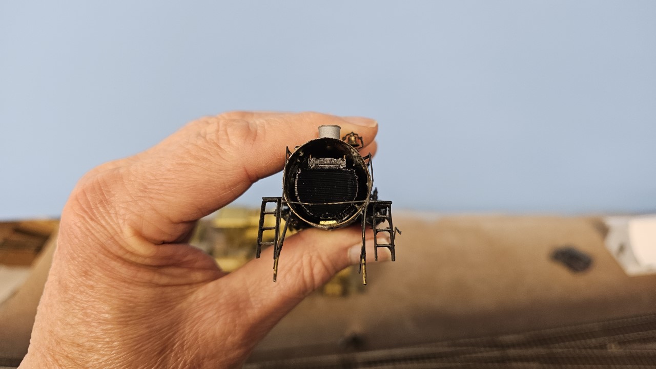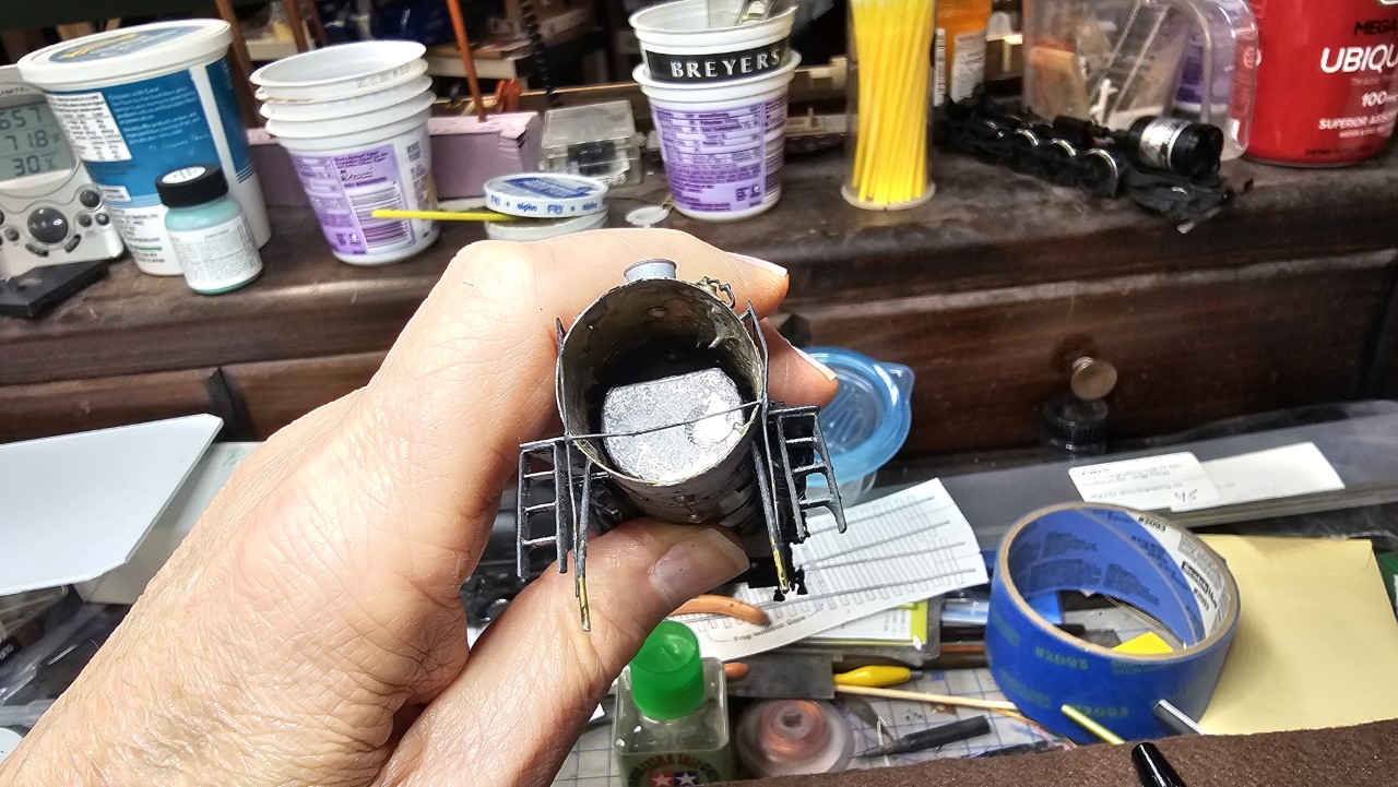 I test fitted the decoder and keep-alive in the boiler. In this shot the keep-alive is above the weight and can't be seen at all. The decoder also partially fits atop the weight. What is left sticking out has plenty of clearance above the gear tower. I wouldn't need to put anything in the tender except one connection wire for power pickup.