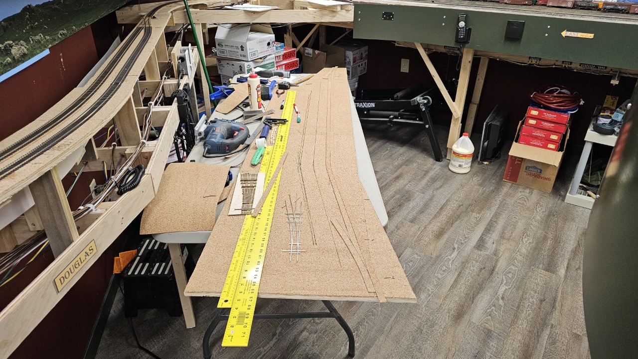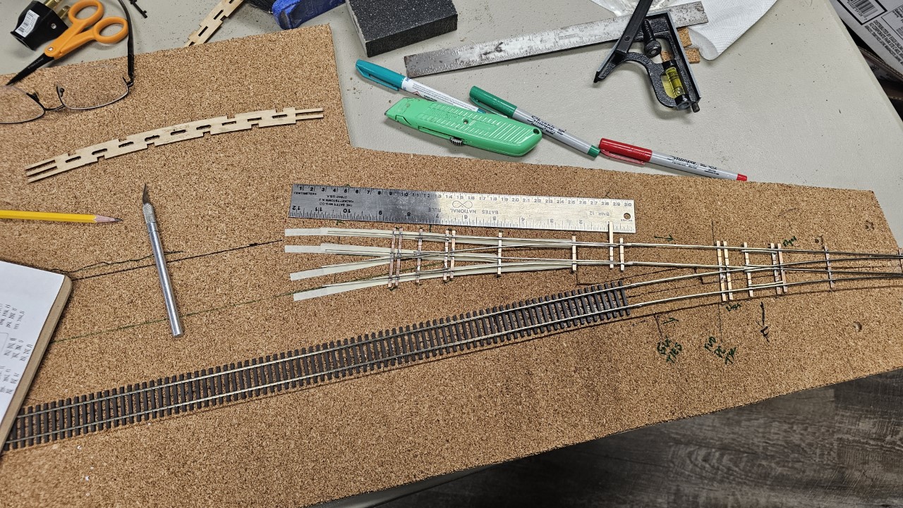 Once I had the exact position of the track at the interface defined, I took the yard back to the table yet again. By January 10th I had the second of layer of cork installed for the roadbed for the mainline, and I marked out the centerlines for the yard tracks. You can see that this was a bit of trial and error, as I had to make adjustments for the turnout geometry.