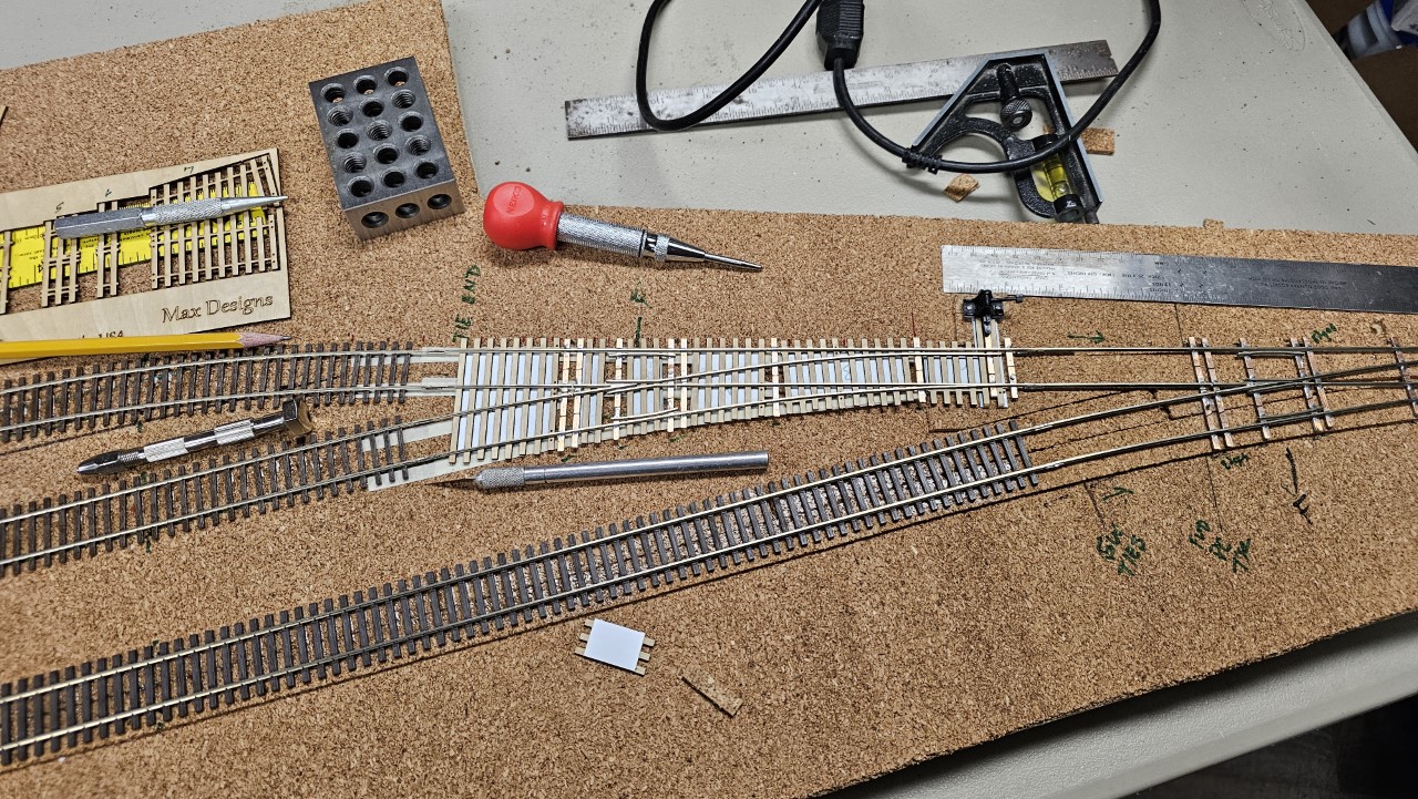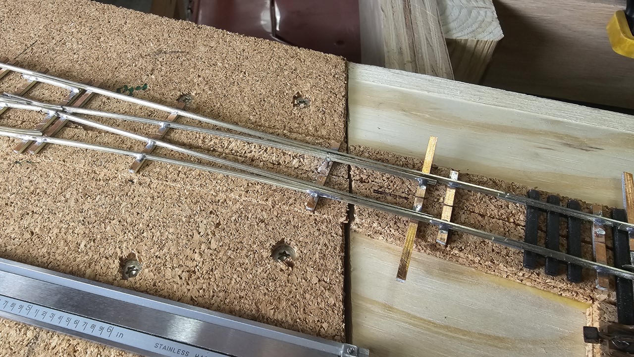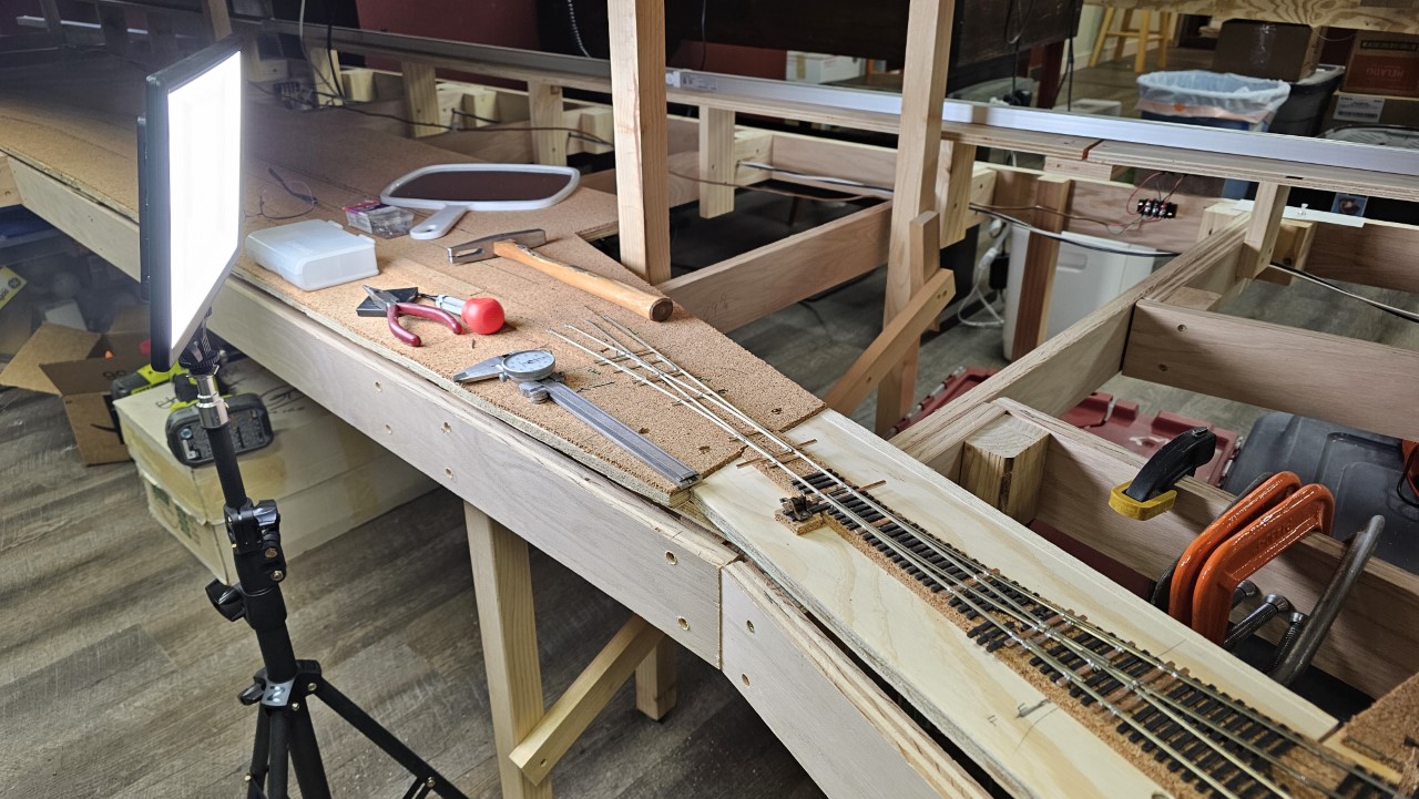While I was waiting for the two-foot lights to arrive I did do some work on the yard on the 17th and 18th. Here, on the 17th, I'm installing the ladder turnout at the east end of the yard. This, the turnout at the other end, and the yard tracks are all code 55.