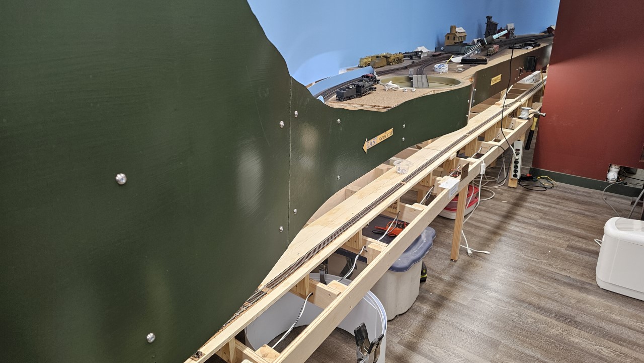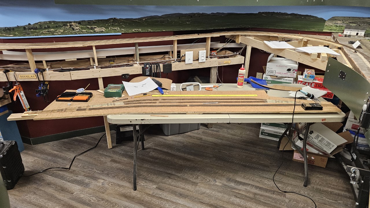 Late on the 24th the yard went back onto the layout, this time for the last time. The connection to Husky was glued and screwed in. Over the next few days I added risers and leveled the yard, then connected all the tracks to the power buss. The only thing left is to run a train into the yard, and into Husky, to test everything out. I have yet to do that.