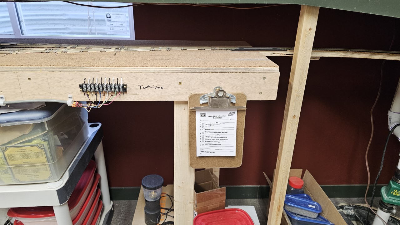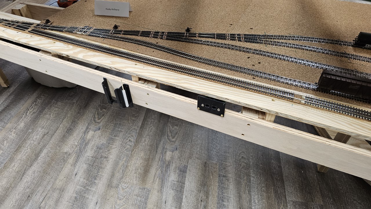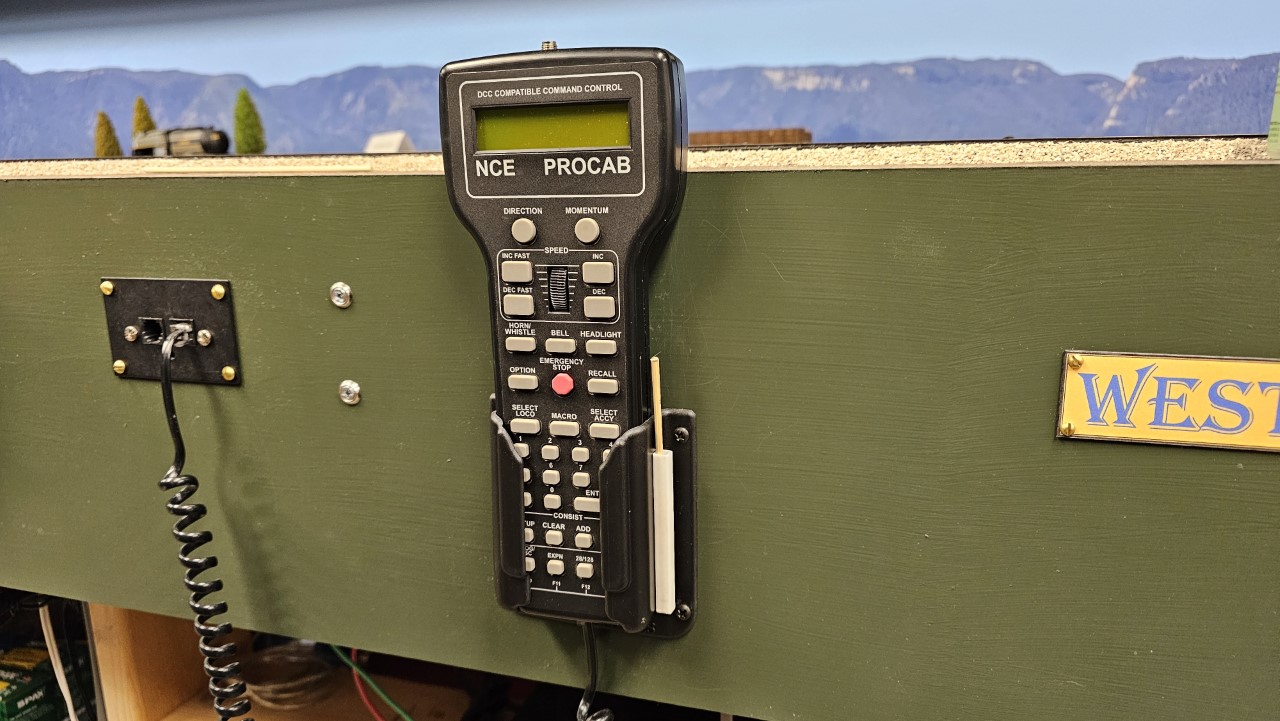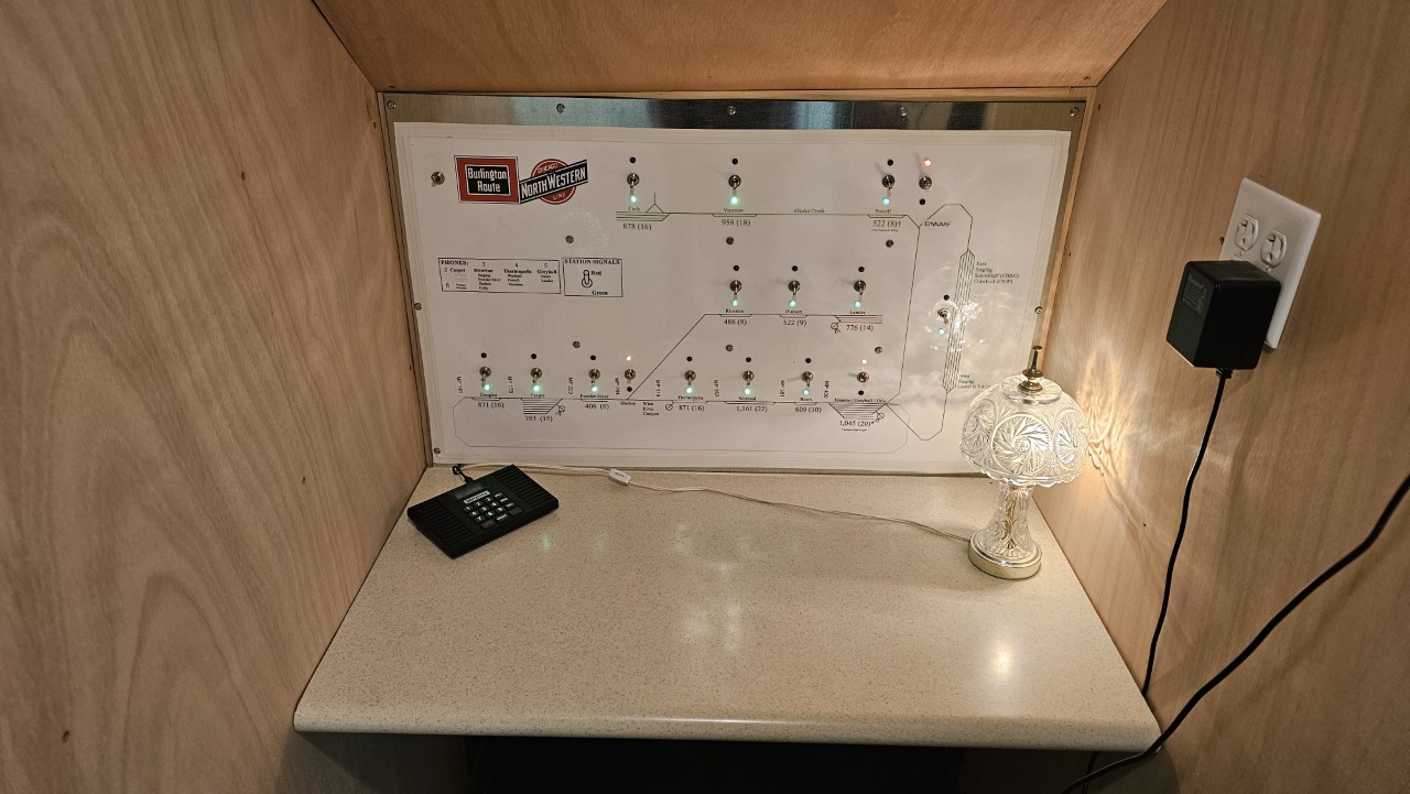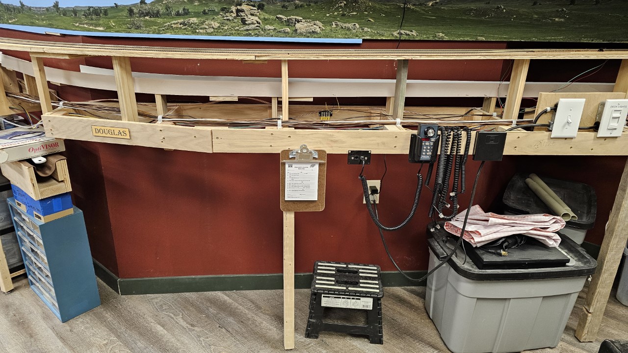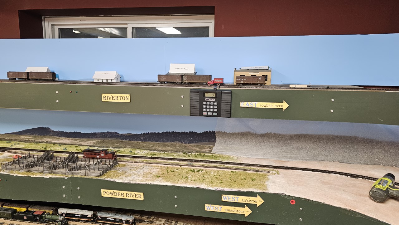 To go along with the intercoms I added small clipboards with blank train orders near the intercoms. Having the operators write their own train orders which the dispatcher dictates over the intercoms, it will eliminate the traffic jam near the dispatcher's desk and reduce the dispatcher's paperwork. This clipboard is attache4d to the edge of the staging yard right underneath Riverton and Powder River: